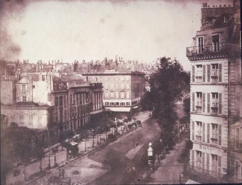 通りの脇には、《辻馬車》、2輪幌馬車が列をなして停まっている。右手のずっと奥には4輪馬車が一台だけ見える。林立する煙突が地平線を飾っている。というのも、[カメラという]器具はそれが見るものすべてを仔細に記録し、煙突だろうが、煙突掃除夫だろうが、ベルヴェデーレ庭園のアポロ像を描写する場合と差別なく公平に描写するからである。